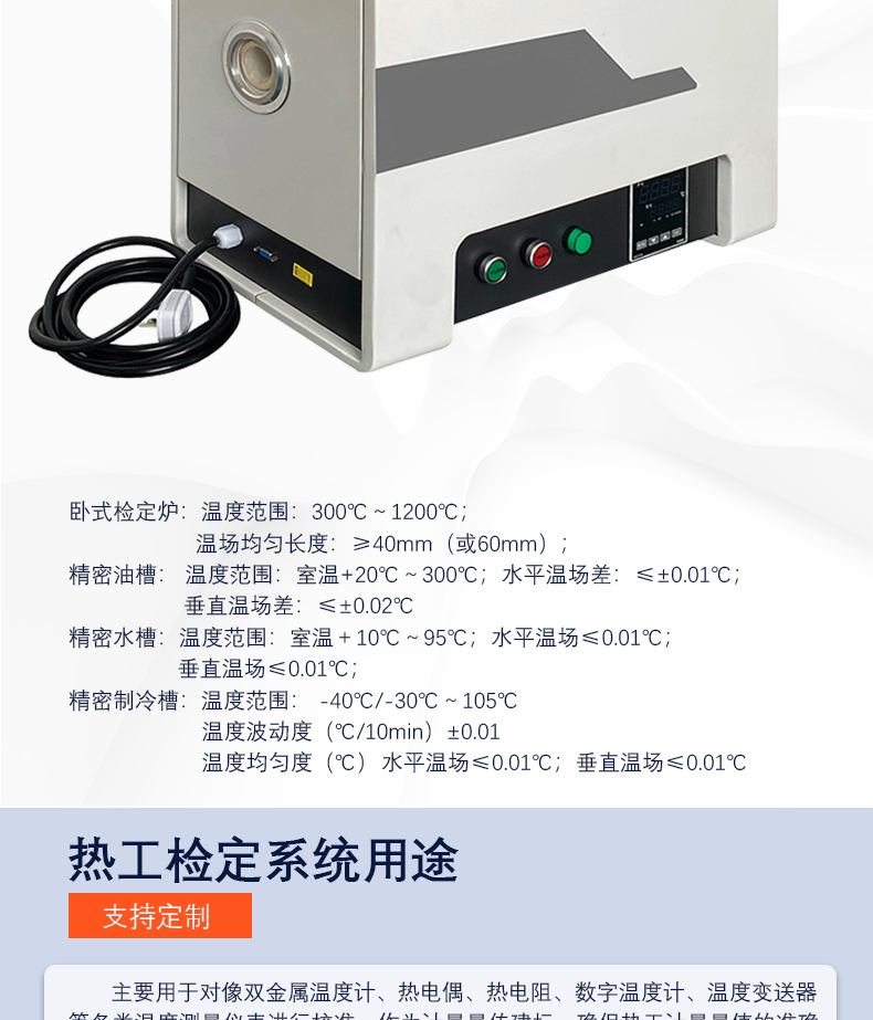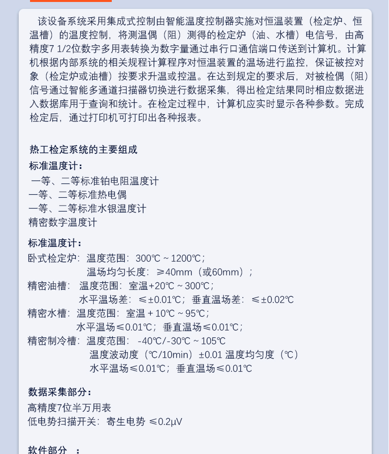 該設(shè)備系統(tǒng)采用集成式控制由智能溫度控制器實(shí)施對(duì)恒溫裝置(檢定爐、恒溫槽)的溫度控制,將測(cè)溫偶(阻)測(cè)得的檢定爐(油、水)電信號(hào),由高精度7 1/2位數(shù)字多用表轉(zhuǎn)換為數(shù)字量通過(guò)串行口通信端口傳送到計(jì)算機(jī)。計(jì)算機(jī)根據(jù)內(nèi)部系統(tǒng)的相關(guān)規(guī)程計(jì)算程序?qū)銣匮b置的溫場(chǎng)進(jìn)行監(jiān)控,保證被控對(duì)象(檢定爐或油槽)按要求升溫或控溫。在達(dá)到規(guī)定的要求后,對(duì)被檢偶(阻信號(hào)通過(guò)智能多通道掃描器切換進(jìn)行數(shù)據(jù)采集,得出檢定結(jié)果同時(shí)相應(yīng)數(shù)據(jù)進(jìn)入數(shù)據(jù)庫(kù)用于查詢和統(tǒng)計(jì)。在檢定過(guò)程中,計(jì)算機(jī)應(yīng)實(shí)時(shí)顯示各種參數(shù)。完成檢定后,通過(guò)打印機(jī)可打印出各種報(bào)表