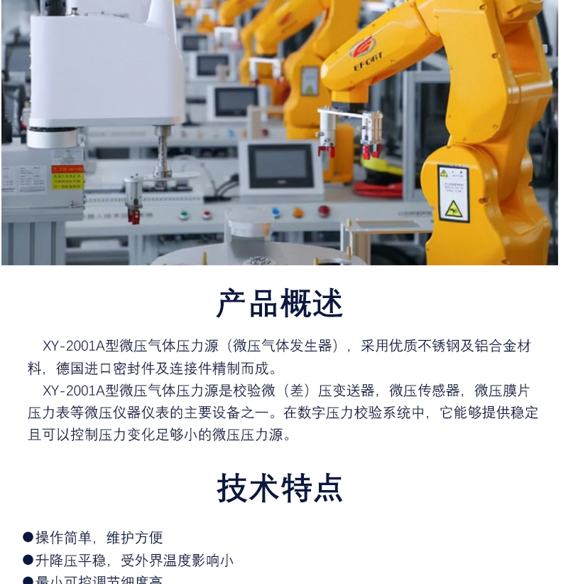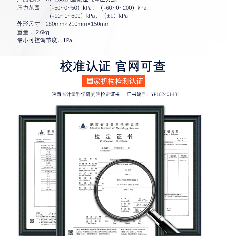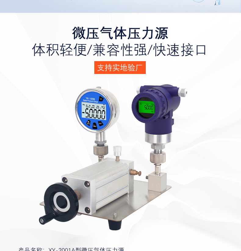 XY-2001A型微壓氣體壓力源(微壓氣體發生器),采用優質不銹鋼及鋁合金材料,德國進口密封件及連接件精制而成。XY-2001A型微壓氣體壓力源是校驗微(差)壓變送器,微壓傳感器,微壓膜片壓力表等微壓儀器儀表的主要設備之一。在數字壓力校驗系統中,它能夠提供穩定且可以控制壓力變化足夠小的微壓壓力源。